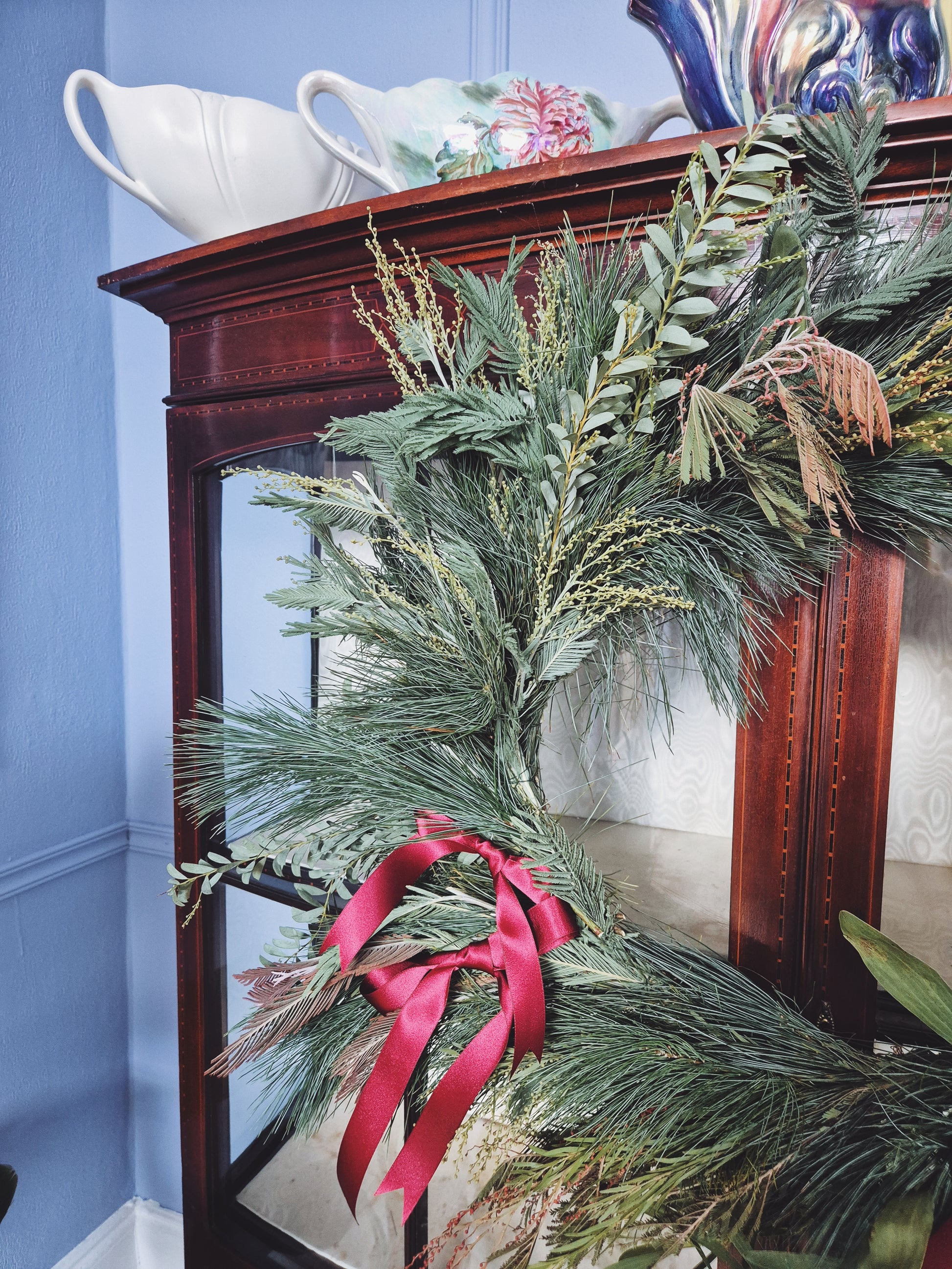 Our signature wreath, full, fragrant greenery finished with rich satin ribbons for a simple yet sophisticated look. Perfect for those who love a refined, minimal festive style.